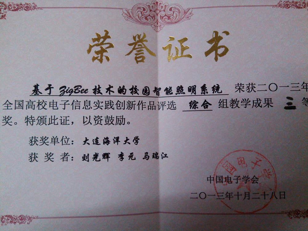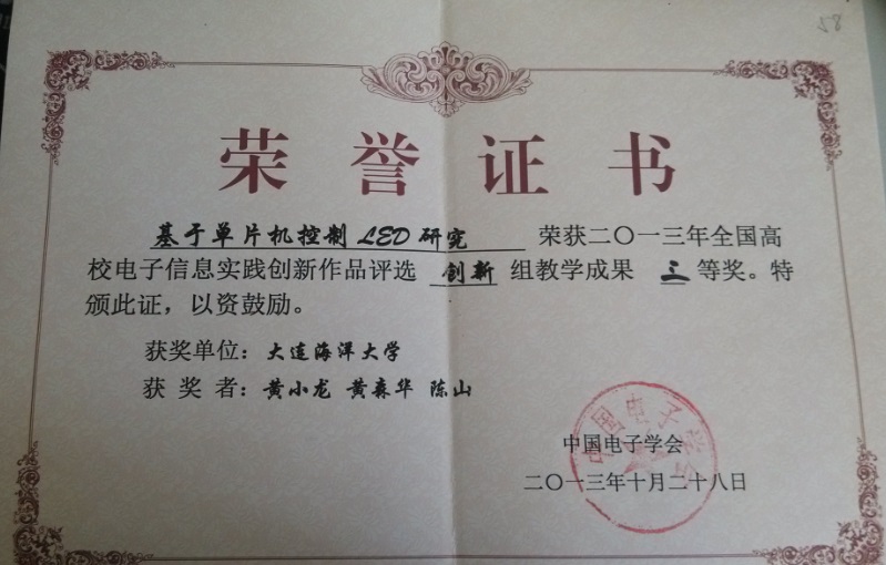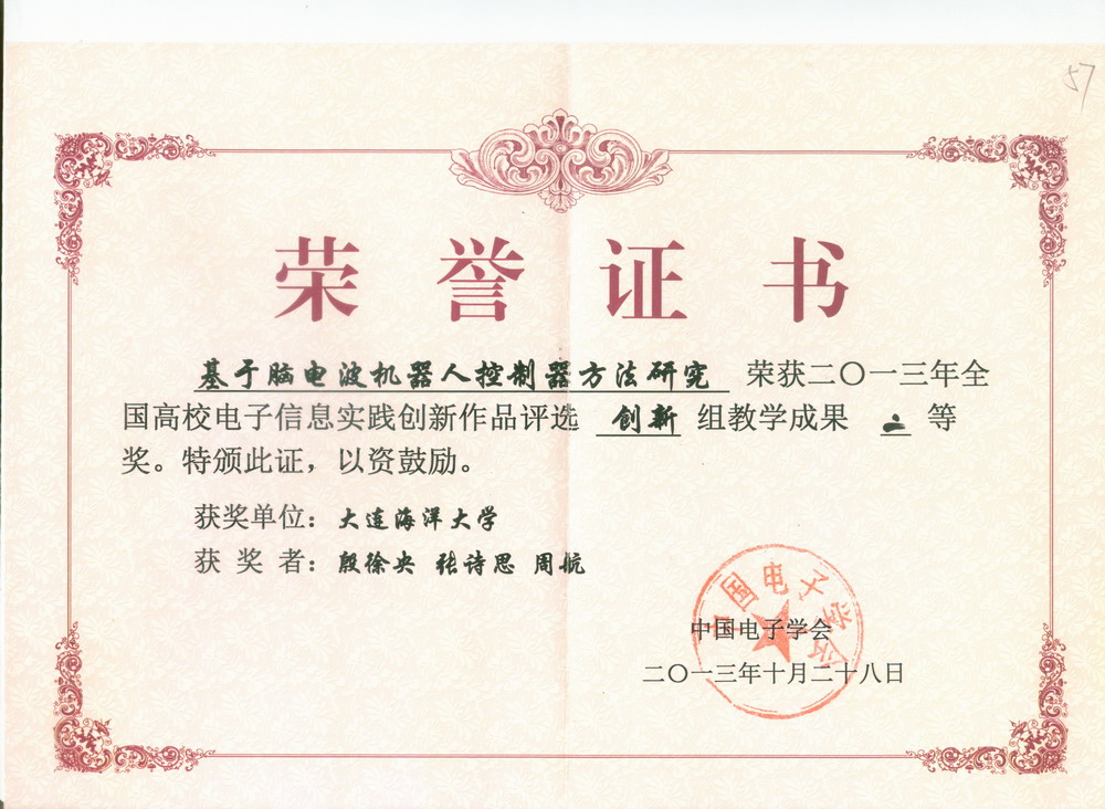日前,由中国电子学会主办的“第四届(2013)全国高校电子信息创新作品评选活动”在京落幕,我院选送三项作品参加比赛。经过初评和复审的层层考核,由宋维波教师指导、学生殷徐央、张诗思、周航完成的作品《基于脑电波机器人控制器的研究》获得创新组二等奖;由刘丹教师指导、学生刘光辉、李元、马瑞江完成的作品《基于ZigBee技术的校园智能照明系统》获得综合组三等奖;由梁策教师指导、学生黄小龙、黄森华、陈山完成的作品《基于单片机控制LED的研究》获得创新组三等奖。
