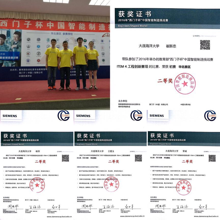 7月21日至7月24日,由教育部高等学校自动化类专业教学指导委员会,西门子(中国)有限公司,中国系统仿真学会共同主办的2016年“西门子杯”中国智能制造挑战赛圆满结束。由教师王魏指导,学生张康、耿浩、曲传馥组成的逻辑控制参赛队获得东北赛区二等奖、辽宁省二等奖。由教师崔新忠指导,学生兰爱玉、常诚、杨菲组成的工程创新参赛队获得华北赛区二等奖。