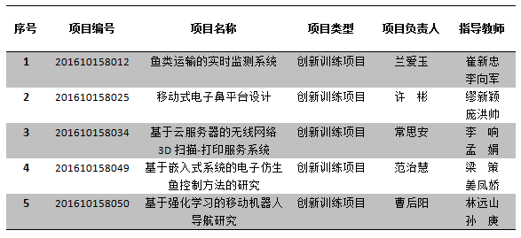近日,学校教务处公布了2016年国家级大学生创新创业训练计划立项项目名单,我院共有5个项目喜获国家级立项。 为了参加此次国家级大创项目的申报,我院积极组织学生报名,安排教师指导学生对项目申报书进行了精心的撰写和修改。在师生们的共同努力下,我院在这次大创计划项目立项中喜获佳绩。