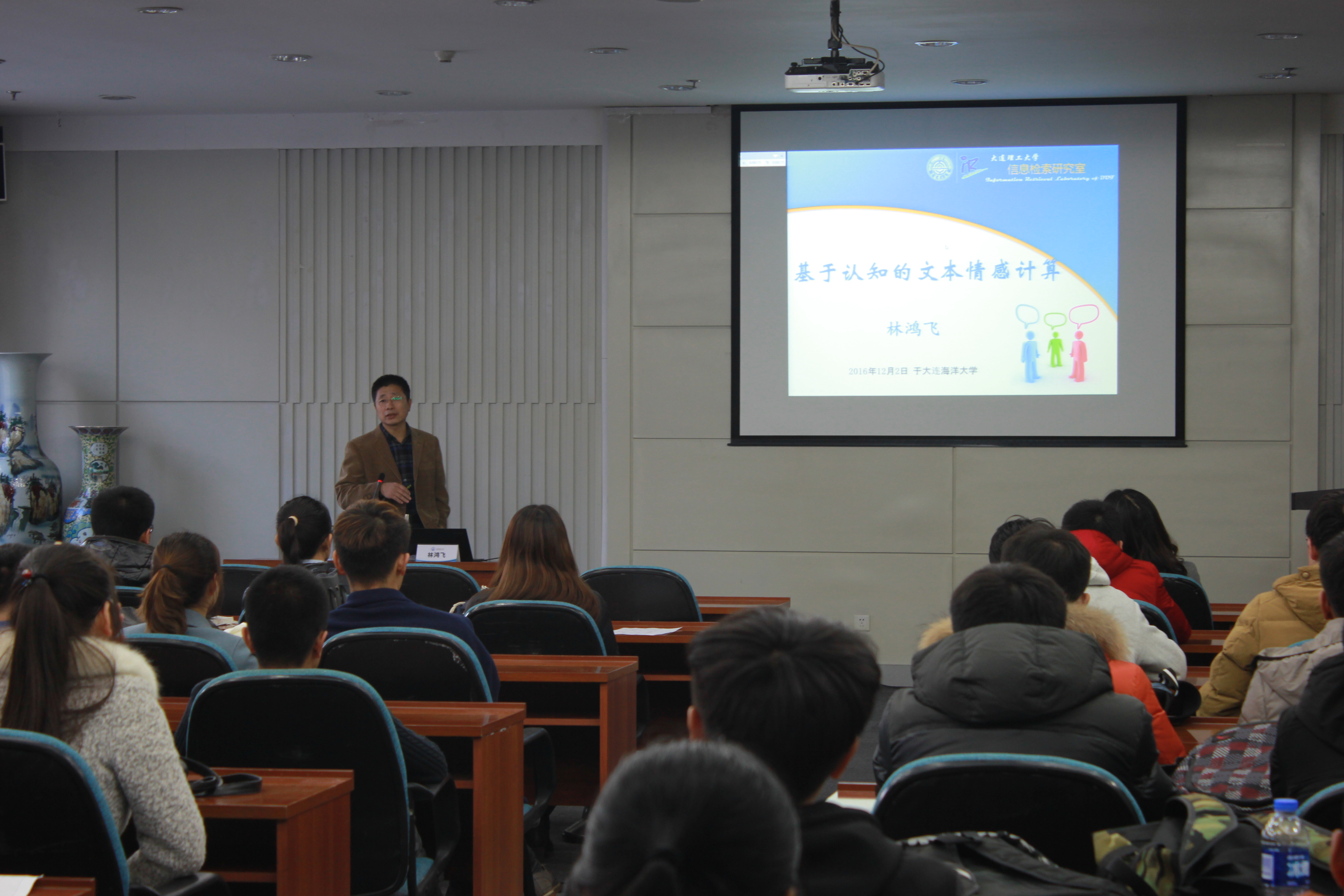 聘任仪式后,林鸿飞在图书馆多功能厅为学院部分教师、研究生和本科生做了题为“基于认知的文本情感计算”的学术报告,报告会由院长于红主持。