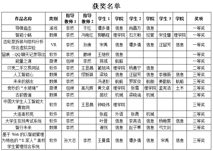 今年我校参加辽宁省计算机设计竞赛由创新创业学院主办、信息工程学院承办,参加学生218人,覆盖学校各专业。最终有15组作品获奖,其中一等奖5项,二等奖1项,三等奖9项,获奖学生36人次,涉及7个学院11个专业,作品在获奖层次、类别、数目、人数上均创历史新高。