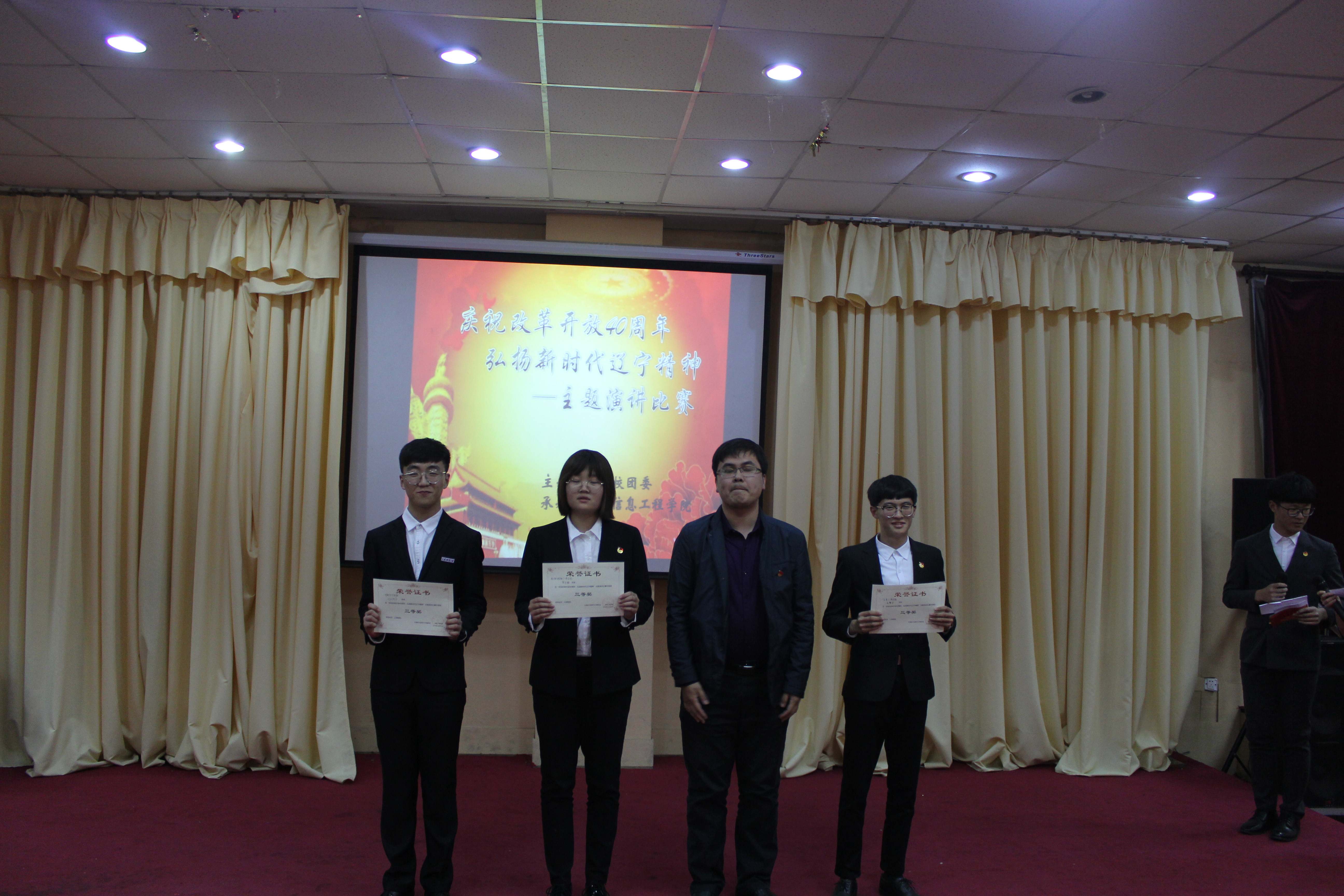 为庆祝改革开放四十周年,引导广大青年团员深入学习贯彻新时代辽宁精神,10月16日,由校团委主办、信息工程学院承办的"庆祝改革开放40年 弘扬新时代辽宁精神"主题演讲比赛最终决赛在实验楼阶梯一举行,校团委老师、各学院团委书记出席了本次比赛。