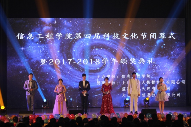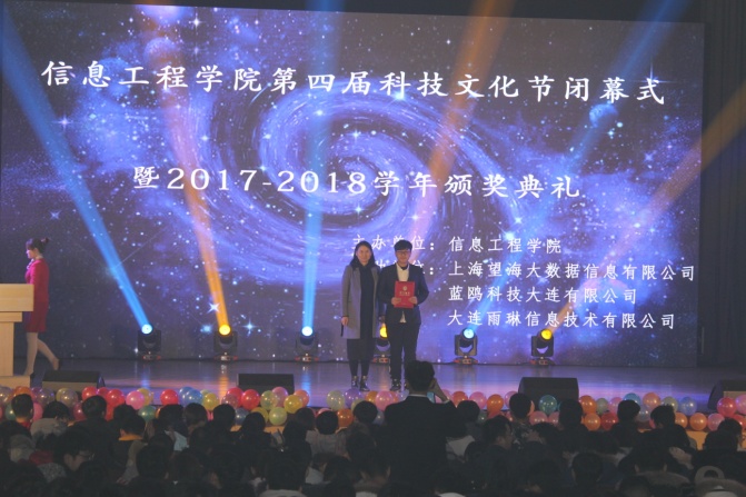 瑞雪初晴,盛会如期而至。12月9日下午,信息工程学院第四届科技文化节闭幕式暨2017-2018学年颁奖典礼在俱乐部隆重举行。信息工程学院领导班子成员,上海望海大数据信息有限公司技术中心副总经理赵鹏,蓝鸥科技(大连)有限公司总经理李恩松,大连雨琳信息技术有限公司总经理程琳,大连雨琳信息技术有限公司人事经理宋莹,学院各教研室主任、专兼职辅导员及全院学生参加了本次典礼。
