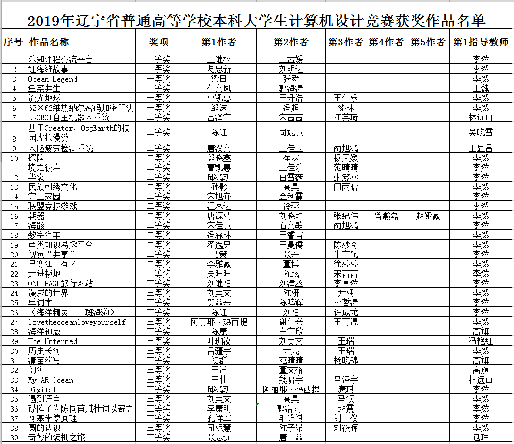 2019年辽宁省普通高等学校本科大学生计算机设计竞赛于5月17-18日在沈阳师范大学顺利举行。我校由信息工程学院组织参赛,经过激烈角逐,最终有39组作品获奖,其中一等奖6项,二等奖16项,三等奖17项,获奖学生108人次,覆盖全校。作品在获奖级别、类别、人数上均创历史新高。大连海洋大学荣获优秀组织单位奖。