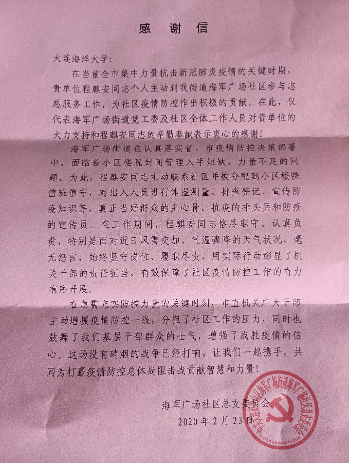程麒安每天的工作是对所辖社区做好封闭检查,在工作中,他认真负责,不辞辛劳,高效完成每日的岗位任务,每天坚持提前到岗,热情服务,在工作中获得社区领导的赞赏和群众认可,大连市中山区海军广场街道海军广场社区总支委员会为此发来感谢信。
