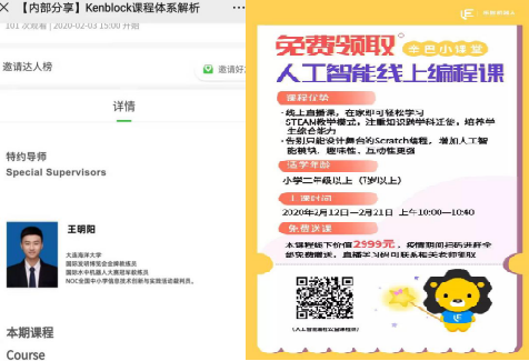 “停课不停学,我来发挥专长帮助他们!”为了让孩子们度过充实快乐的假期,虽然王明阳家住辽宁朝阳市,他远程联合乐智(大连)教育科技有限公司、大连市秀月小学、大连市CBE学会人工智能分会,充分发挥专业特长,利用乐智机器人编程平台和网络在线直播软件,为全国的孩子免费提供在线教育资源和直播课程,讲解了编程语句及部分人工智能的初步应用。王明阳共主讲十次直播课,约有500人参加学习,共计4000人次,在线辅导不仅充实了孩子们的假期,也为他们传授了科学知识、启发了学习兴趣,受到家长好评。