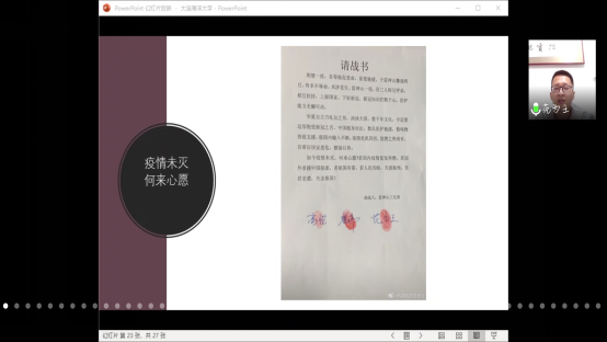范医生还向大家分享了一些有趣的小故事临行前随手拿着的给猫修剪毛的推子却成为了许多医护人员们剃头发的工具、通过微博沟通帮助就医家属找到了在雷神山接受治疗的父亲等等助人事迹。范医生的讲述让参会师生党员感受到疫情席卷时,党中央的坚强领导和全国人民的众志成城,具有强大凝聚力的祖国构筑起了无数小家幸福安康的坚强保障;感受到医务人员的奉献与担当,一封封请战书,一个个红手印,展现出白衣战士冲锋在前,抗击疫情的坚定决心;众志成城,没有克服不了的困难;齐心协力,没有跨不过的沟坎。