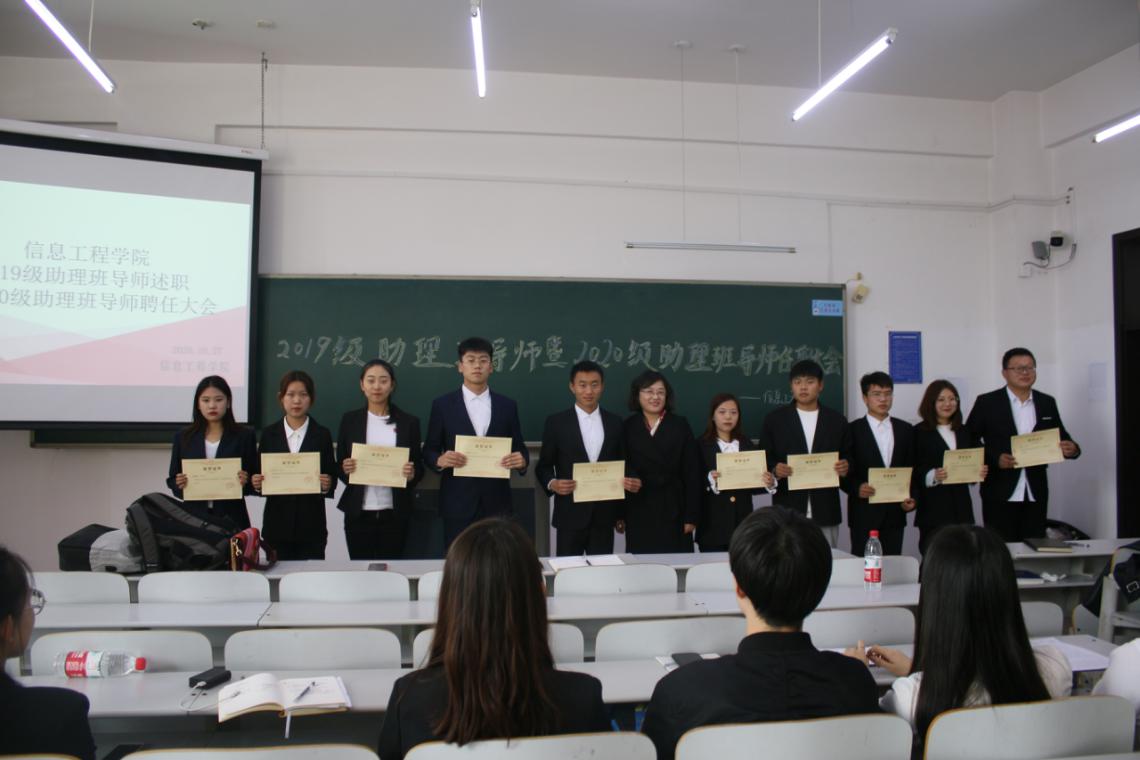 为进一步加强信息工程学院的学生工作队伍建设,更好的推进网格式立体化学生思想政治教育模式,全方位的开展学生思想政治教育工作。 10月28日,信息工程学院在獐教111组织并召开2019助理班导师述职暨2020级助理班导师聘任大会。信息工程学院党总支副书记范庆华、学院团委书记王建东、辅导员范晓旭、2018级全体学生干部及2019、2020级助理班导师参加了本次会议,会议由团委宣传部部长杜慧妍主持。