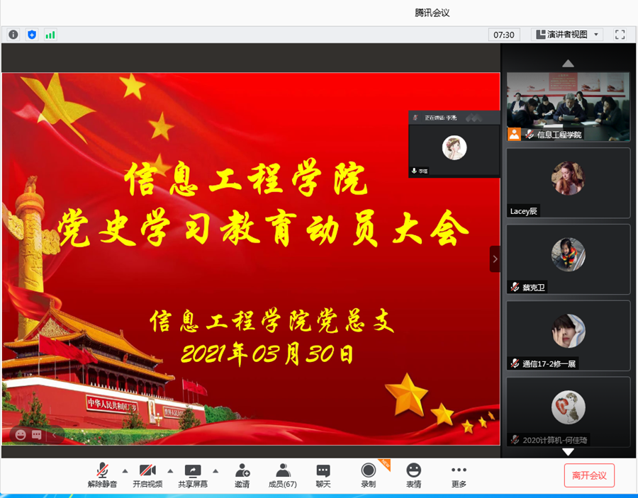 3月30日下午,信息工程学院党总支在党员活动室召开党史学习教育动员大会,班子成员、总支委员、支部书记在党员活动室参会,其他党员通过腾讯会议参会,党总支书记于振作做了动员讲话,党总支副书记范庆华主持会议。