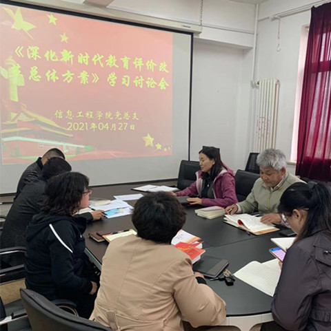 4月27日上午,信息工程学院党总支在党员活动室召开了《深化新时代教育评价改革总体方案》学习讨论会,总支委员、各党支部书记参加会议,会议由党总支书记于振作主持。