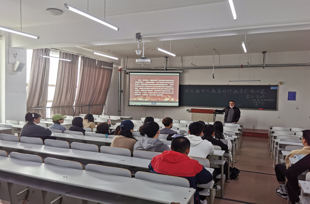 会上,王建东宣布了本次党日活动的主要内容并强调了此次党日活动的重要性和必要性,同学们共同观看学习了由刘自成主讲的《深化新时代教育评价改革总体方案》解读视频。