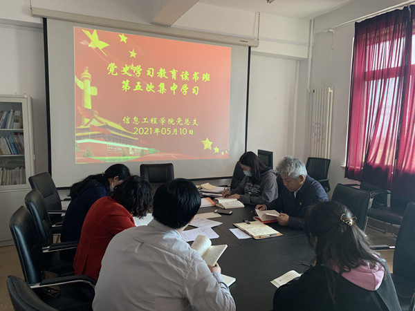 5月10日下午,信息工程学院党总支在学院党员活动室开展第五期党史学习教育读书班集中学习。党总支委员、支部书记参加了学习会议。会议由党总支书记于振作主持。