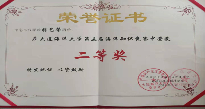 本次比赛共三轮,分别为争分夺秒、抢占先机、险中求胜。经过三个环节的激烈比拼,我院选手张艺馨与海洋科技与环境学院学生比分打平,并列第一。随后,两位选手进行了加试赛,最终信息工程学院荣获“第五届海洋知识竞赛”二等奖。