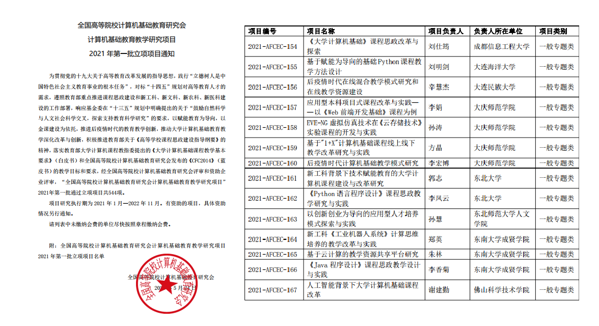 近日,全国高等院校计算机基础教育研究会公布了2021年计算机基础教育教学研究项目评审结果,我院数据科学与大数据技术专业教师刘明剑申报的课题“基于赋能为导向的基础 Python 课程教学方法设计”获批一般专题类课题,课题编号2021-AFCEC-155。