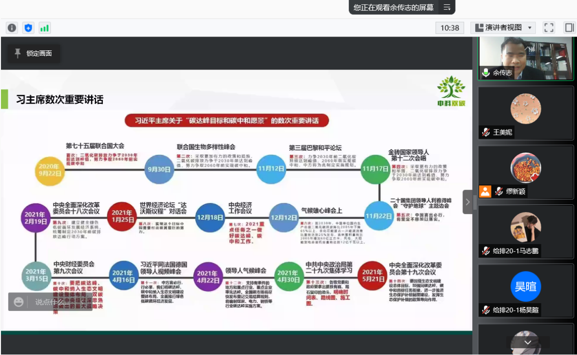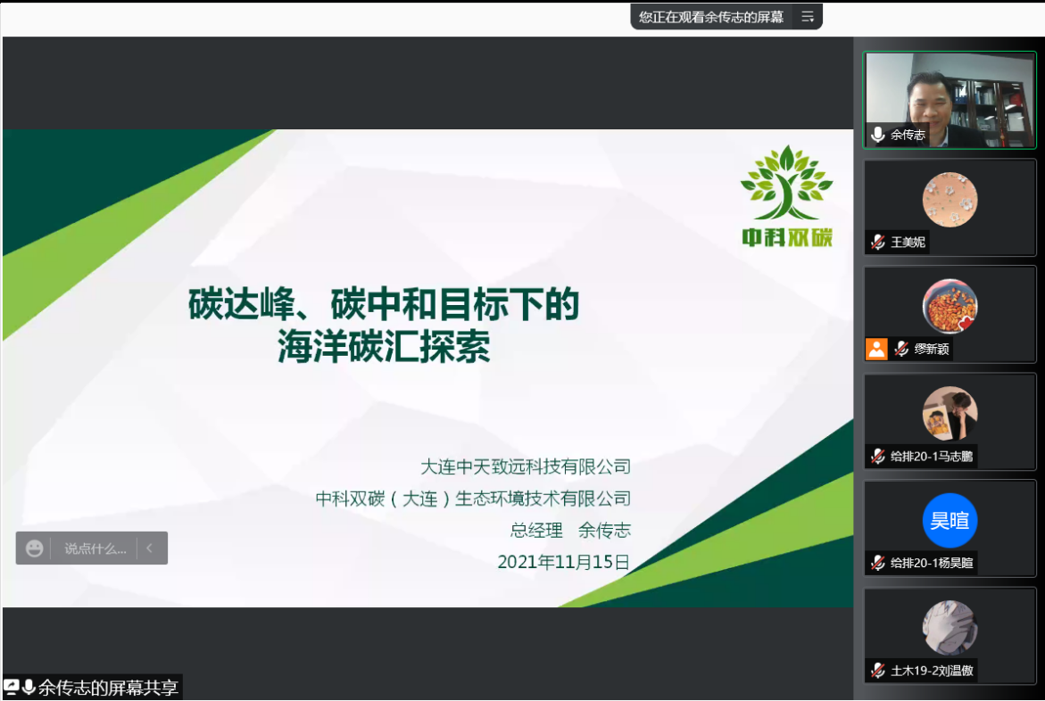 余传志的报告主题为《碳达峰碳中和目标下的海洋碳汇探索》,他从双碳相关政策解读、产业的机遇与挑战、碳市场发展概况、海洋碳汇核算体系和双碳下的创业机遇五个方面综述了海洋碳汇的探索模式,结合自身在专业领域的研究经验与实践成果,提出对中国低碳技术的建议及创新创业切入点,点明了双碳背景下高校与企业所肩负的时代任务,激励在读学生多出成果、出好成果。