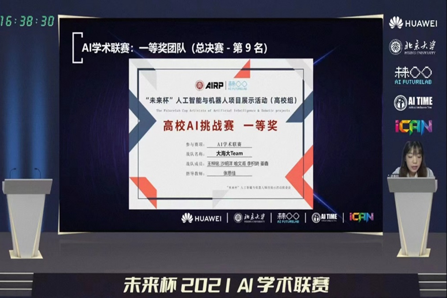 2021年11月13日,由北京大学软件工程国家工程研究中心主办的2021“未来杯”高校AI学术联赛总决赛圆满落幕。我院由智慧渔业创新团队海洋渔业领域知识管理与应用方向张思佳副教授指导,王梓铭(20级计算机)、沙明洋(20级计算机)、喻文甫(20级电子信息)、李枳錡(20级计算机)、姜鑫(19级计算机)五位研究生组成的大海大Team战队以全国16强的身份进入总决赛,终获一等奖(排名第9),是前10名中唯一一所双非院校获奖团队。