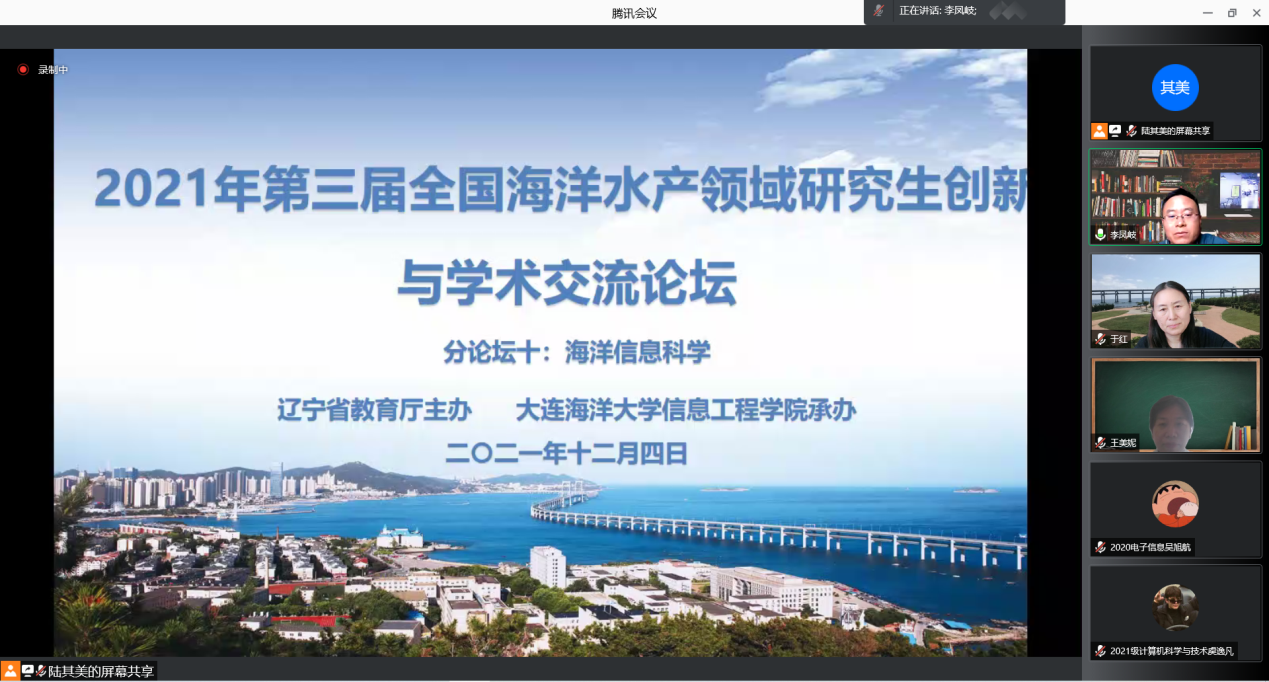 2021年12月4日,本着以充分发挥研究生在科学研究中的主力军作用,提高全国海洋水产领域研究生学术交流与创新能力的原则,信息工程学院通过腾讯会议方式线上成功承办了 “2021年全国海洋水产领域研究生创新与学术交流——海洋信息科学分论坛”。