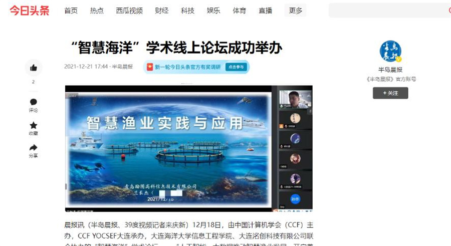 12月18日,由中国计算机学会(CCF)主办,我校信息工程学院和YOCSEF 大连共同承办的“智慧海洋”学术论坛——“人工智能、大数据推动智慧渔业发展,开启养殖模式新时代!”技术论坛线上成功举行。信息工程学院院长于红,我校以及大连相关高校师生,企事业单位代表等共计70余人参加了论坛。本次论坛由信息工程学院刘明剑博士担任执行主席。