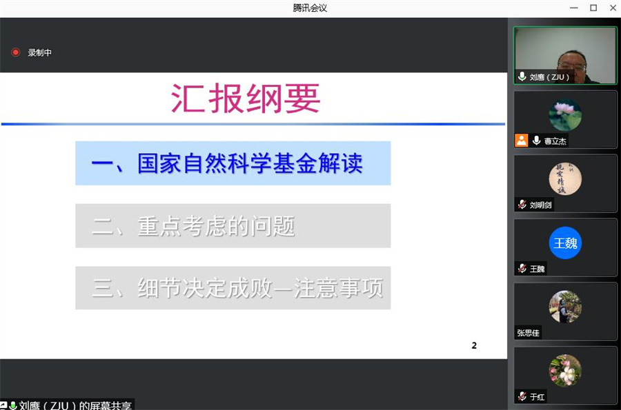 2022年1月22日,浙江大学刘鹰教授受邀通过腾讯会议为我院教师做了“国家自然科学基金申报的几点体会”的学术报告。院长于红,副院长曹立杰,部分教师参加了报告会,会议由于红主持。