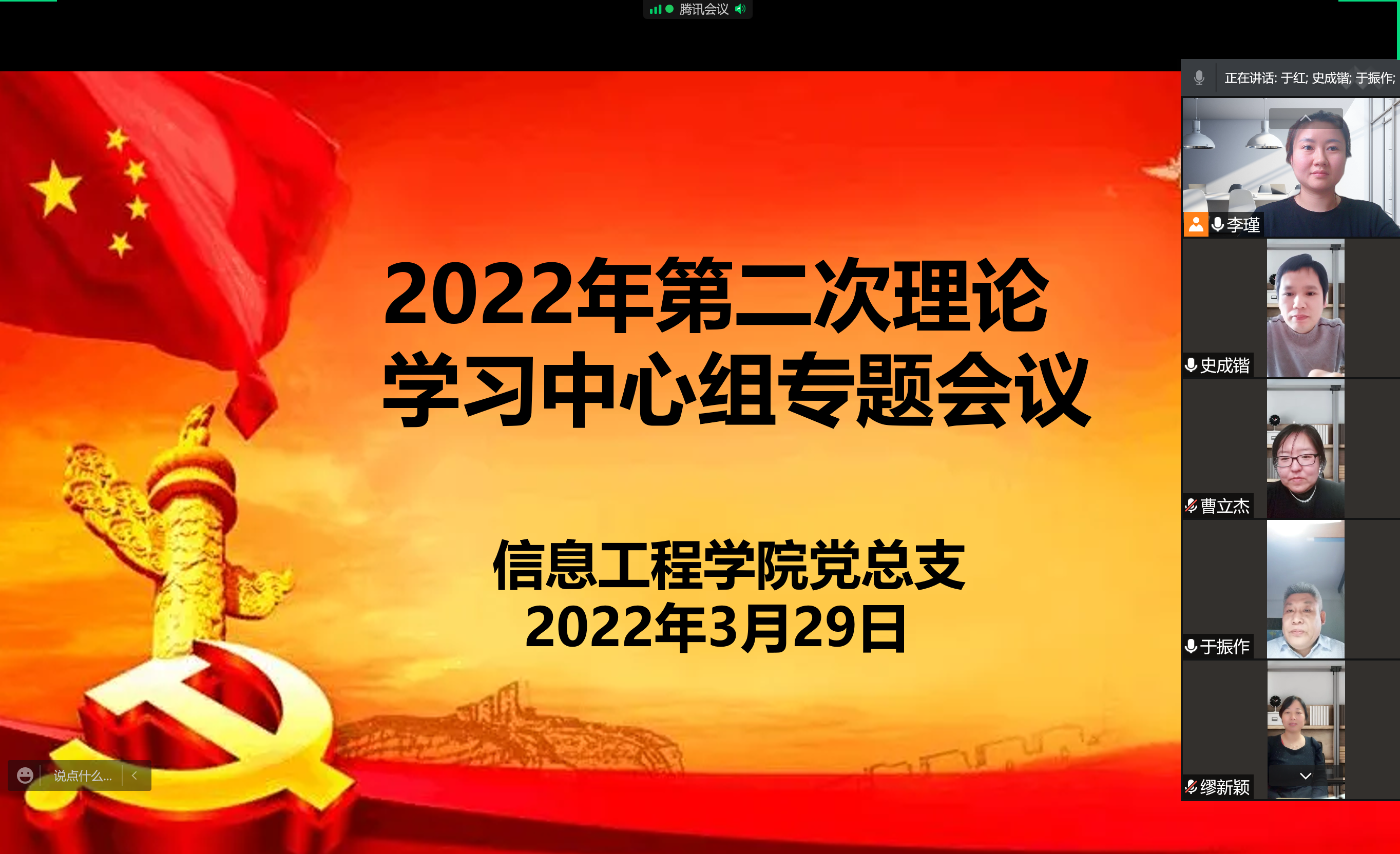 3月29日,信息工程学院党总支在腾讯会议线上召开了2022年第二次理论学习中心组专题学习会议,本次会议由党总支书记于振作主持,理论中心组全体成员参加了会议。