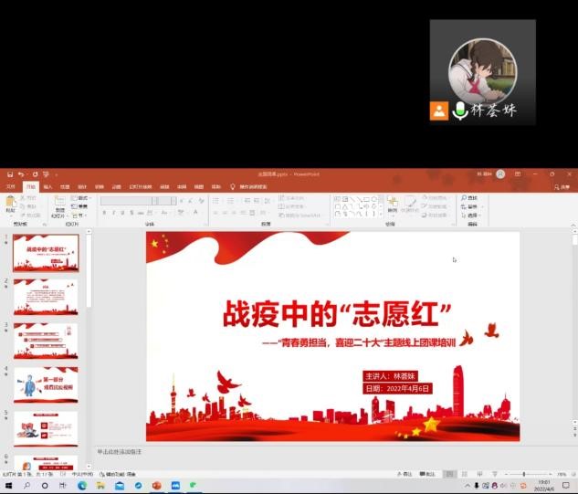 为进一步加强疫情防控的教育引导,激发广大共青团员的责任担当,信息工程学院于2022年4月6日19:00召开了以“青春勇担当,喜迎二十大”为主题的线上团课。本次讲座由团委副书记林荟妹主持,学院全体班委参加。