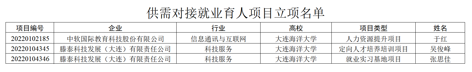近日,教育部高校学生司发布了《教育部高校学生司开元网页版登录入口公布第一期供需对接就业育人项目立项名单的通知》(教学司〔2022〕7号),我院与中软国际教育科技股份有限公司、滕泰科技发展(大连)有限责任公司等企业合作的3个就业育人项目获批立项。