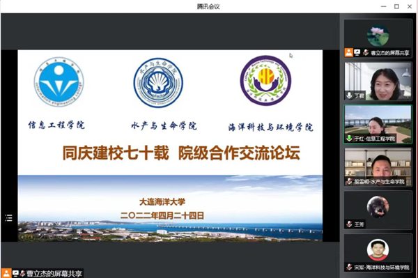 4月24日下午,由水产与生命学院、海洋科技与环境学院、信息工程学院联合发起,信息工程学院承办的同庆建校七十载 院际合作交流论坛通过腾讯会议线上举办,论坛由信息工程学院院长于红、副院长曹立杰主持, 水产与生命学院副院长(主持工作)丁君、海洋科技与环境学院院长宋军出席了本次论坛,全校共有60余师生参加了论坛。
