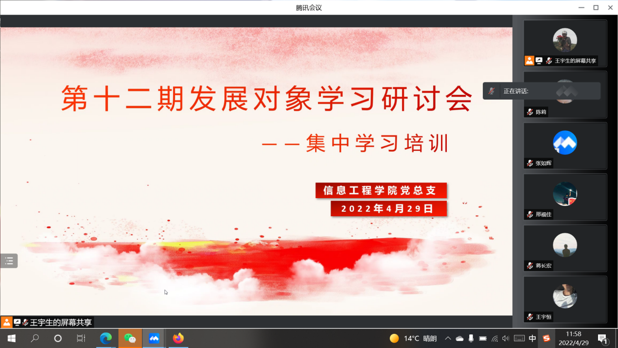 信息工程学院于2022年4月29日12:00以腾讯会议形式召开第十二期发展对象学习研讨会。李瑾和第十二期发展对象参加了本次集中学习培训,会议由张爽主持。