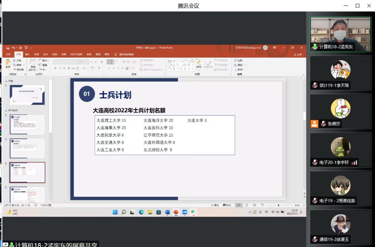 为进一步激发学生的考研热情,明确考研目标,掌握考研技巧。信息工程学院于2022年5月13日以腾讯会议形式举办“研途畅享,助力绽放”考研经验交流会。学院副院长曹立杰、党总支副书记范庆华、2019级辅导员张萌莎出席会议。本次会议由李天琦、李宇轩主持,学院2019级、2020、2021级部分学生参会。