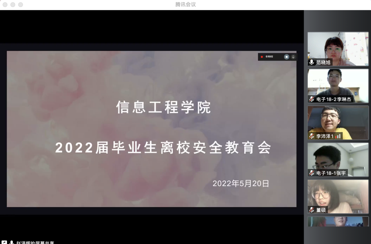 信息工程学院于2022年5月20日18:00通过腾讯会议召开毕业生离校安全教育会,会议由2018级辅导员范晓旭主持,全体毕业生参加会议。