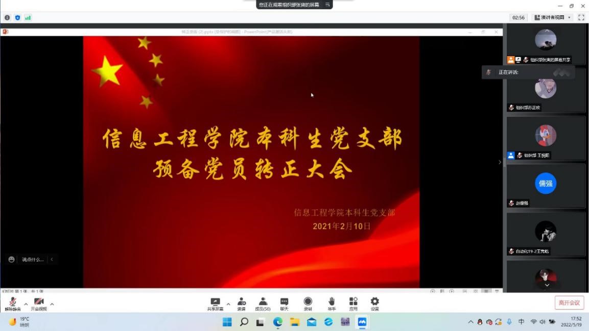 信息工程学院于2022年5月19日18:00以腾讯会议的形式召开了预备党员转正大会。信息工程学院党总支副书记范庆华以及全体正式党员和预备党员参加此次会议。会议由陈莉主持。