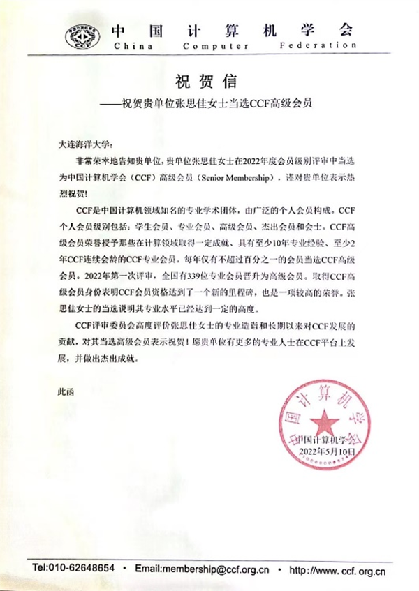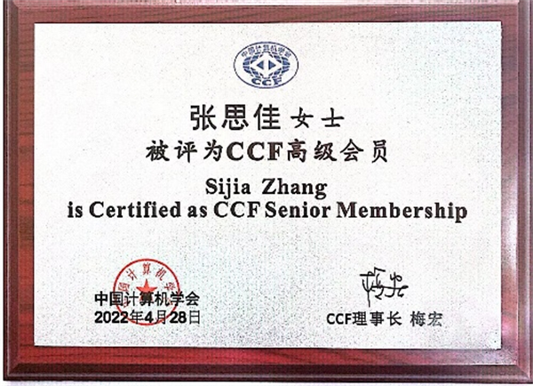 近日,中国计算机学会(CCF)向我校发来祝贺信,祝贺我校信息工程学院张思佳副教授在2022年度会员级别评审中当选中国计算机学会(CCF)高级会员(Senior Membership)。