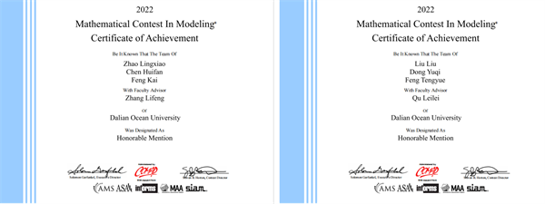 近日,2022年美国大学生数学建模竞赛(MCM/ICM)成绩正式公布,大连海洋大学本科生组成的5支队伍成功参赛。其中赵凌霄及刘留、董宇棋、冯腾跃组成的两支队伍获得 Honorable Mention(二等奖)。胡祥瑞、左佳玉、张汉松詹泽荣高雨萱宋博知、郑鑫、牛浩骅、韩文淋等九人组成的三支队伍获得Successful Participant(三等奖)。