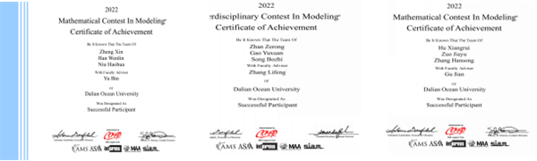 近日,2022年美国大学生数学建模竞赛(MCM/ICM)成绩正式公布,大连海洋大学本科生组成的5支队伍成功参赛。其中赵凌霄及刘留、董宇棋、冯腾跃组成的两支队伍获得 Honorable Mention(二等奖)。胡祥瑞、左佳玉、张汉松、詹泽荣、高雨萱、宋博知、郑鑫、牛浩骅、韩文淋等九人组成的三支队伍获得Successful Participant(三等奖)。