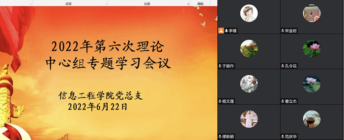 6月22日,信息工程学院党总支在腾讯会议线上召开了2022年第六次理论学习中心组专题学习会议,本次会议由党总支书记于振作主持,理论中心组成员参加了会议。
