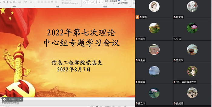 8月7日,信息工程学院党总支通过腾讯会议线上召开了2022年第七次理论学习中心组专题学习会议,本次会议由党总支书记于振作主持,理论中心组全体成员参加了会议。