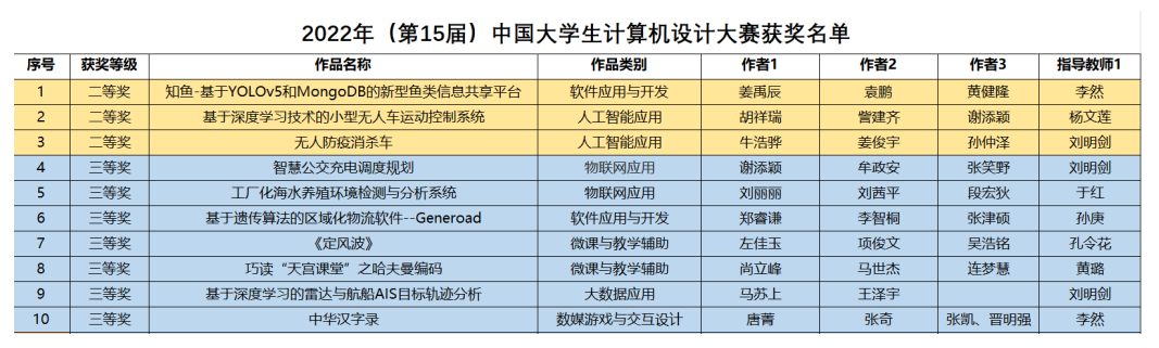 由教育部高等学校大学计算机课程教学指导委员会、中国大学生计算机设计大赛组织委员会联合主办的“2022年(第15届)中国大学生计算机设计大赛”全国总决赛近日落下帷幕,大赛分为软件应用与开发、人工智能应用、物联网应用、数媒静态设计、数媒游戏与交互设计等类别。我院参赛师生经过激烈角逐,取得优异成绩,获得二等奖3项、三等奖7项。展现了信息学子的实力和风采。
