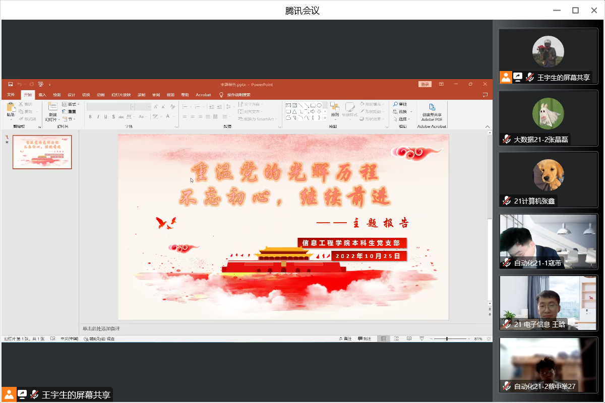信息工程学院于2022年10月25日18:30以线上腾讯会议的形式召开了“重温党的光辉历程,不忘初心,继续前进”的主题会议。第十六期入党积极分子参加了本次报告会,马克思主义学院蔡静老师主讲。会议由学生会组织部部长王宇生主持。