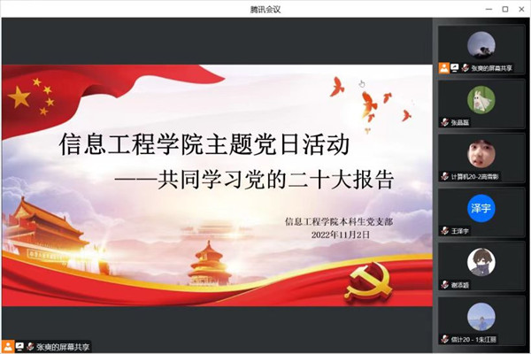 2022年11月2日,信息工程学院本科生党支部开展“共同学习党的二十大报告”主题党日活动。本次活动由张爽主持,学院党委副书记范庆华、各年级辅导员以及全体学生党员出席活动。