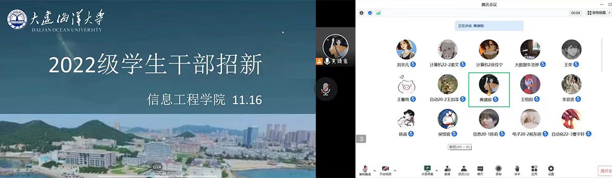 信息工程学院于2022年11月16日通过腾讯会议开展2022级团委学生会纳新面试,会议由信息工程学院学生会主席黄靖宸主持,2020级主席团、部长团成员以及2022级竞选同学参会。
