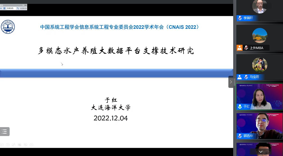 12月3日-4日,中国系统工程学会信息系统工程专业委员会2022学术年会(CNAIS 2022)通过在线会议形式举行。我院院长于红教授受邀在CNAIS 2022学术年会 - CCF TCIS特邀论坛上作题为“多模态海洋渔业大数据平台支撑技术研究”的学术报告,论坛由清华大学经济管理学院郭迅华教授和中国人民大学许伟教授主持。于红教授分别从主题报告的研究背景、水产养殖大数据平台架构及问题分析、养殖环境数据获取与分析、水产养殖图像和视频数据分析与应用、水产养殖文本数据分析与应用等方面介绍了我校智慧渔业创新团队的相关研究成果,最后对该领域的未来发展趋势进行了展望。报告展示了我校计算机科学与技术学科在智慧渔业领域的研究成果,提升了我校计算机科学与技术学科的国内影响力,进一步促进学科建设与发展。