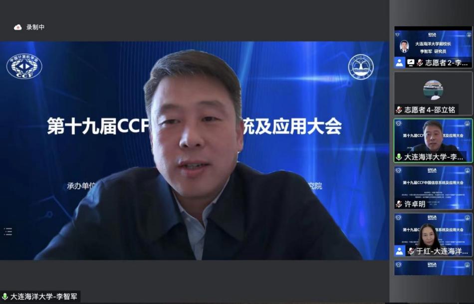 2022年12月3日-4日,由中国计算机学会(CCF)主办,中国计算机学会信息系统专业委员会、大连海洋大学、大连市大数据产业发展研究院联合承办的“第十九届CCF中国信息系统及应用大会”在线上召开。大连金普新区管委会副主任于洋女士、大连海洋大学副校长李智军研究员、大连市大数据产业发展研究院副院长李先能教授、CCF专委工作委员会委员南京航空航天大学教授陈兵、CCF信息系统专委会主任东北大学教授于戈出席大会并致辞。开幕式由学院院长于红主持,来自全国信息系统领域的知名专家学者和产学研各界代表300余人线上出席大会。