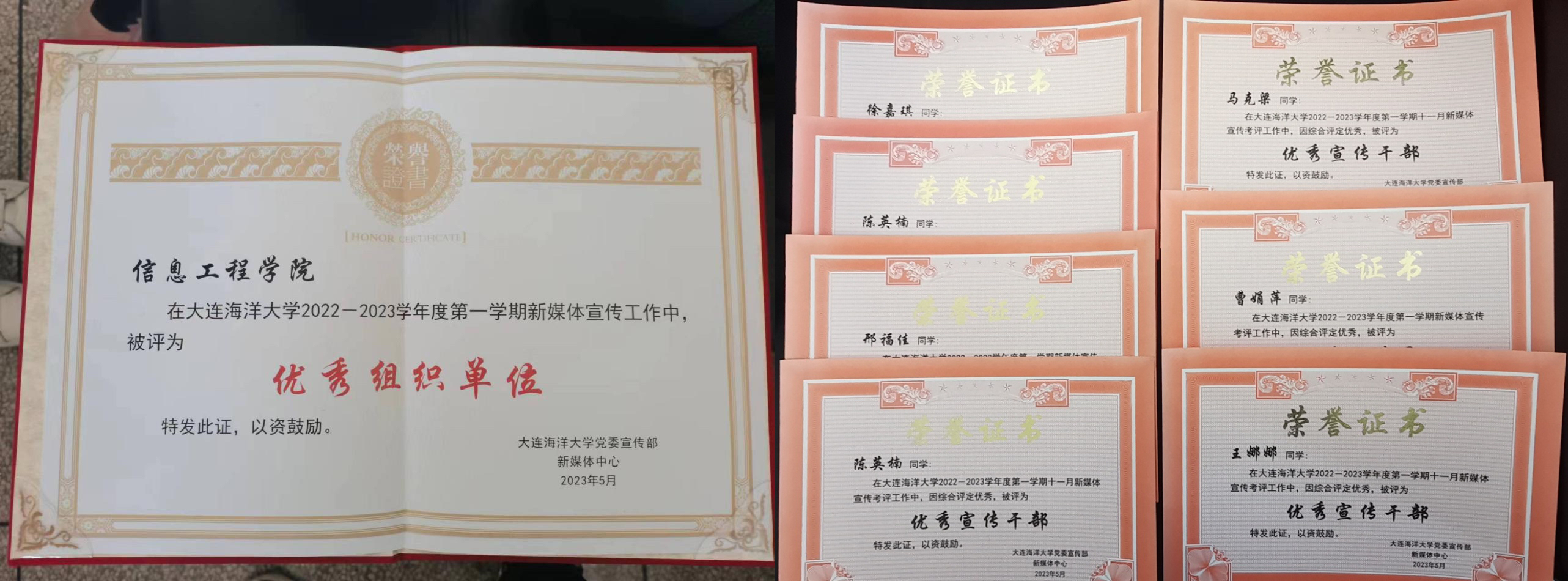 2022年5月,在大连海洋2022-2023学年度第一学期新媒体工作中,大连海洋大学党委宣传部评定信息工程学院为“优秀组织单位”。
