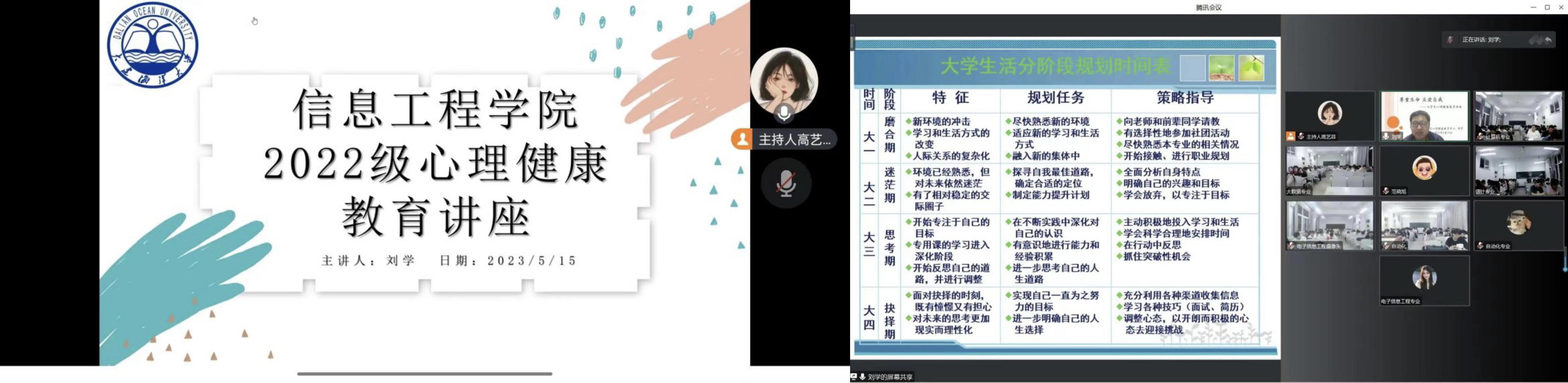 为帮助同学们学会关爱自我,了解自我,接纳自己,进而关注自己的心理健康和心灵成长,提高自身心理素质。信息工程学院于2023年5月15日18:40召开心理健康教育讲座,本次讲座由心理健康中心刘学老师主讲,高艺菲主持,2022级全体学生聆听讲座。