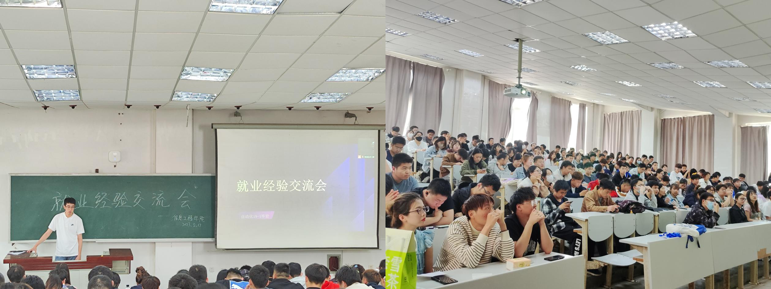 信息工程学院于2023年5月17日13:30在实验楼阶梯教室二召开薪火永相传:“激扬青春,‘职’引未来”——2024届就业经验交流会,2024届毕业生辅导员修恒哲、2023届5名已就业毕业生以及2024届全体学生参加本次会议,此次会议由寇芾主持。