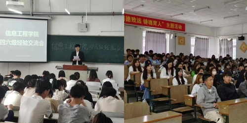 信息工程学院于2023年5月24、25日下午分别在黄海、渤海校区召开2022-2023学年“举引航之灯,照成才之路”—四六级考试经验交流会,信息工程学院2020级、2021级、2022级全体同学出席本次会议,会议分别由李博和许姝蕾主持。