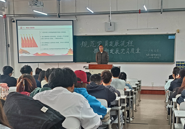 信息工程学院党委于2023年10月23日在獐教103教室召开了“规范党员发展流程 提示新发展党员质量”主题报告会。院本科生支部书记修恒哲做主题报告,第十八期积极分子全体参加此次主题报告会议。会议由李子慧主持。