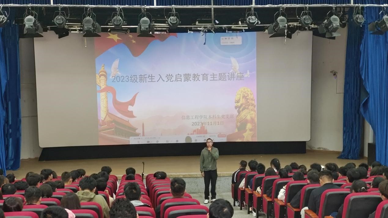为引导学生正确认识中国共产党,进一步坚定理想和信念。信息工程学院于2023年11月1日在渤海校区阶二教室开展了新生入党启蒙教育主题讲座,信息工程学院团委书记修恒哲担任主讲。党委副书记范庆华,2023级辅导员宋子奇和2023级新生全员参加本次讲座。