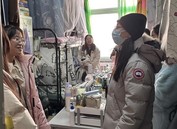 为进一步落实学生寝室安全卫生教育和管理,营造良好的学习生活环境,提升同学们的安全防范意识,引导学生养成良好的生活习惯,2023121212002023级辅导员张萌莎、宋子奇带队进入渤海校区三舍、五舍寝室进行卫生安全大检查,对学生寝室用电安全、卫生、安全隐患等情况进行排查。