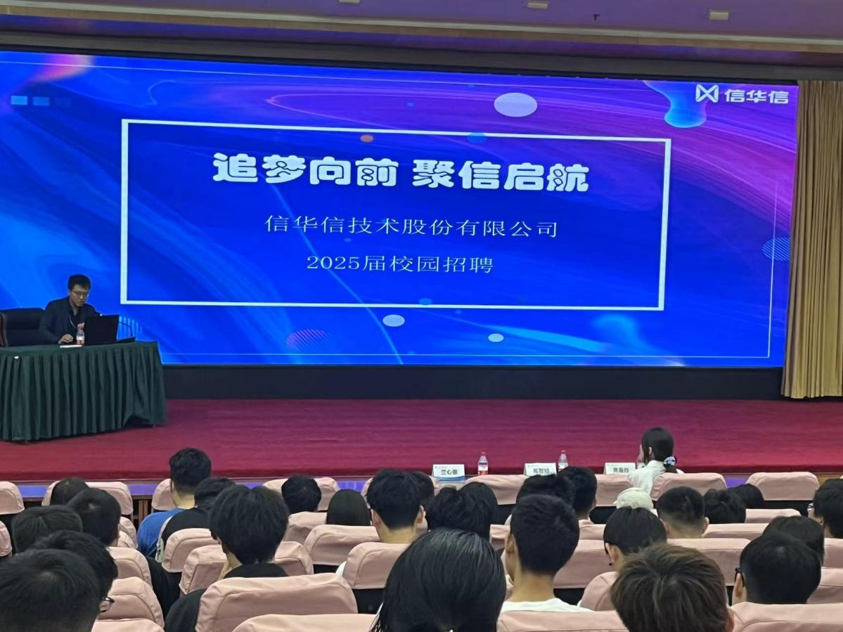 为提高学生对专业相关企业和工作内容的了解,进一步拓展2025届毕业生就业岗位,提升毕业生就业质量。2024年6月5日,信息工程学院在黄海校区图书馆报告厅举办“追梦向前,聚信启航”信华信2025届校园专场招聘宣讲会。信华信技术股份有限公司培训中心校企合作经理陈智桢、兰心惠,2021级辅导员黄曼玲,2021级和2022级学生代表参加宣讲会。会议由黄曼玲主持。